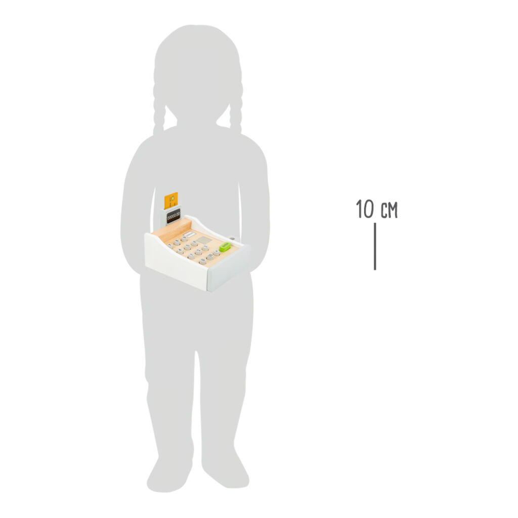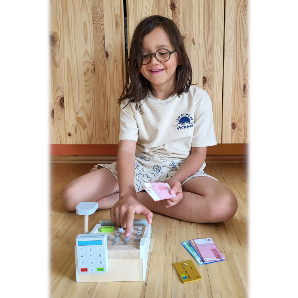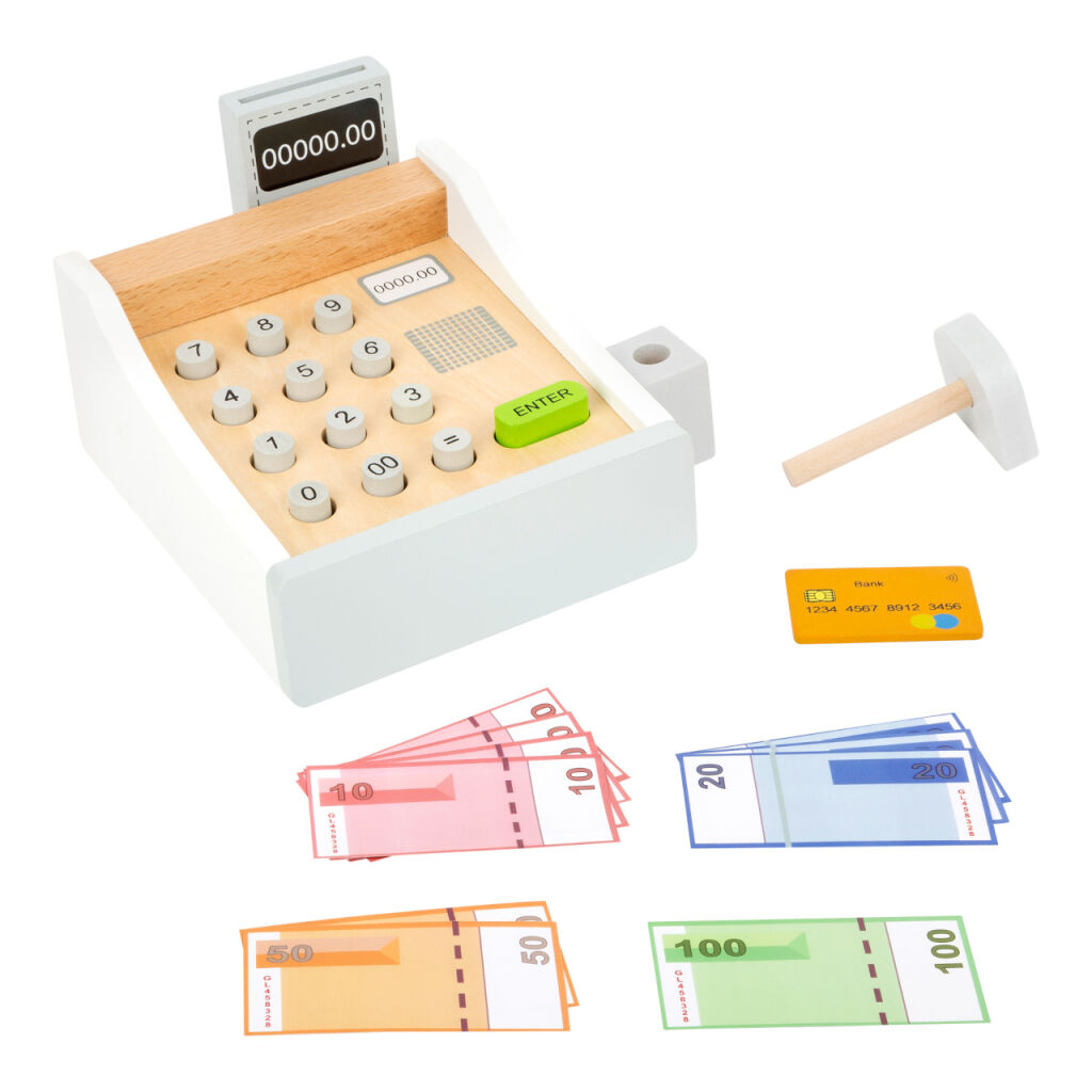 Peníze se jen sypou! Tato krásná dřevěná pokladna patří do každé dobře organizované dětské prodejny. Hraní s touto hračkou pomáhá dětem pochopit ceny zboží a manipulaci s penězi. Součásti jsou bankovky na hraní a dřevěné kreditní karty, které se pohodlně vejdou do spodní zásuvky. Cena zakoupeného zboží může být zadána na klávesnici. Kdo je další na řadě?
