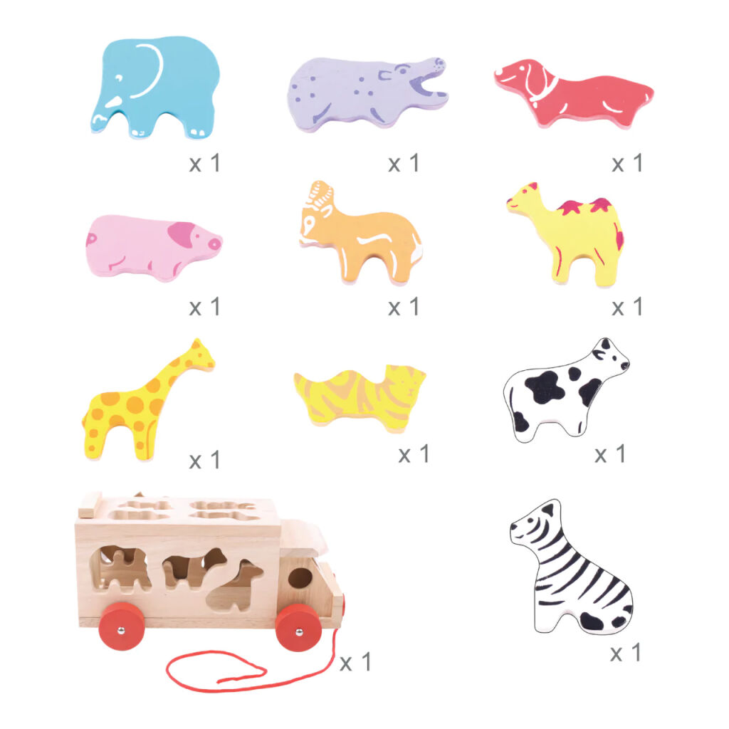 Roztřiďte tvary a naučte se vše o zvířatech. Vložte každé zvířátko do správné díry, zkontrolujte, zda jsou zadní dveře zavřeny, táhnutím za šňůrku můžete vyjet. Tato pestrobarevná dřevěná zvířata lze naložit na nákladní vůz pomocí speciálních otvorů. Pomáhá rozvíjet zručnost a koordinaci ruka-oko. Vyrobeno z vysoce kvalitních materiálů z odpovědných zdrojů. Vyhovuje současným evropským bezpečnostním normám. V balení 11 dílků.