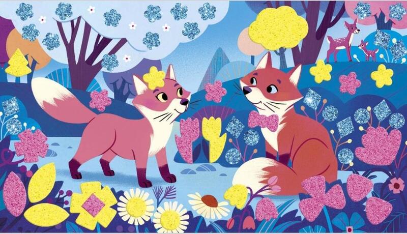 Obsahuje 3 desky-obrázky (20,7 x 11,8 cm), zobrazující setkání lesních zvířátek. Ilustrace by měly být na vhodných místech zdobeny fluorescenčním pískem (růžovým nebo žlutým) a pěnovými nálepkami.